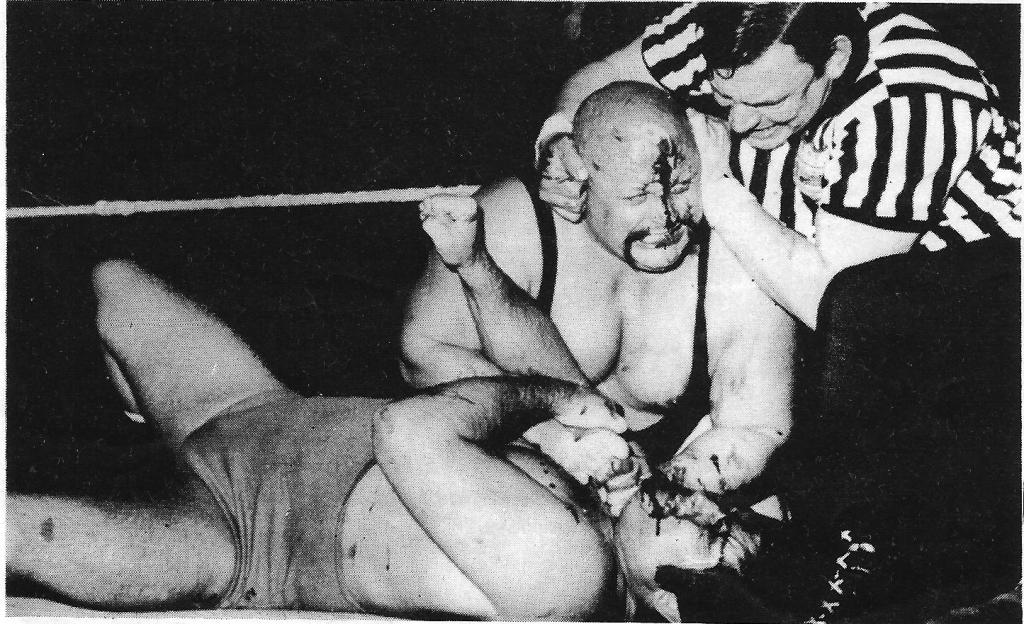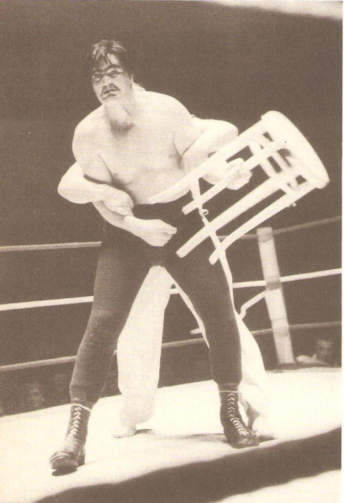 Dirty Dominic Pye doesn’t want to know about restraint. The use of props in wrestling matches became commonplace after the Heritage years, with the bell, steel chairs and “foreign objects” of all kinds coming into play. Years ago, however, television producers strictly forbade such atrocities so when sixties fans saw this photo in the 1968 Pictorial History of Wrestling, well, we were flabbergasted.