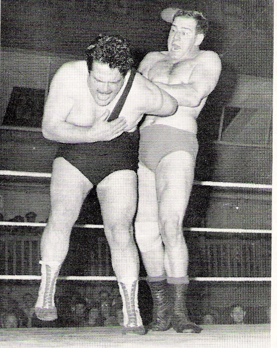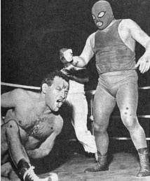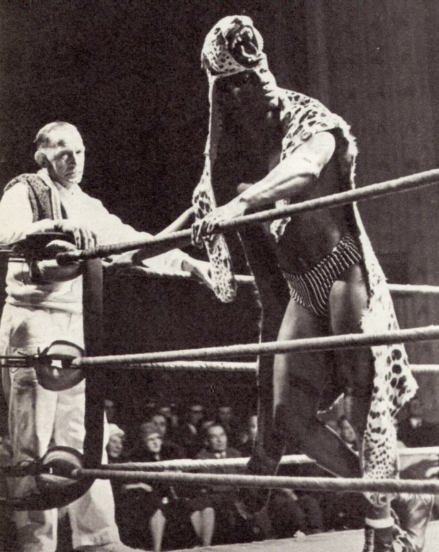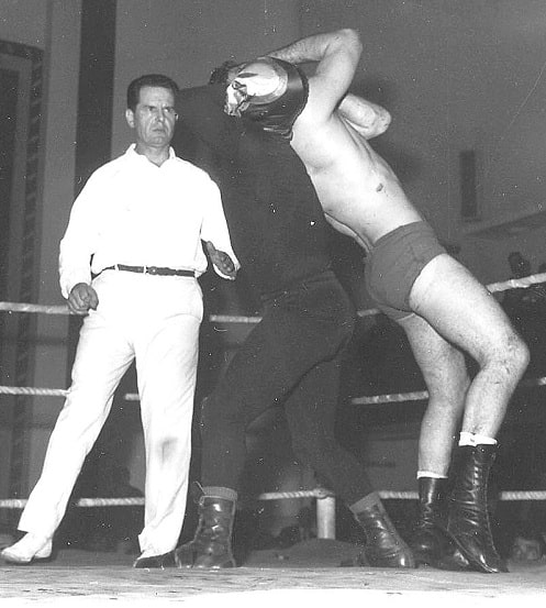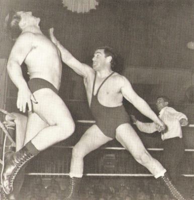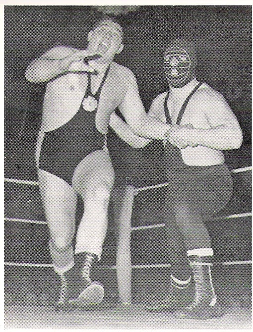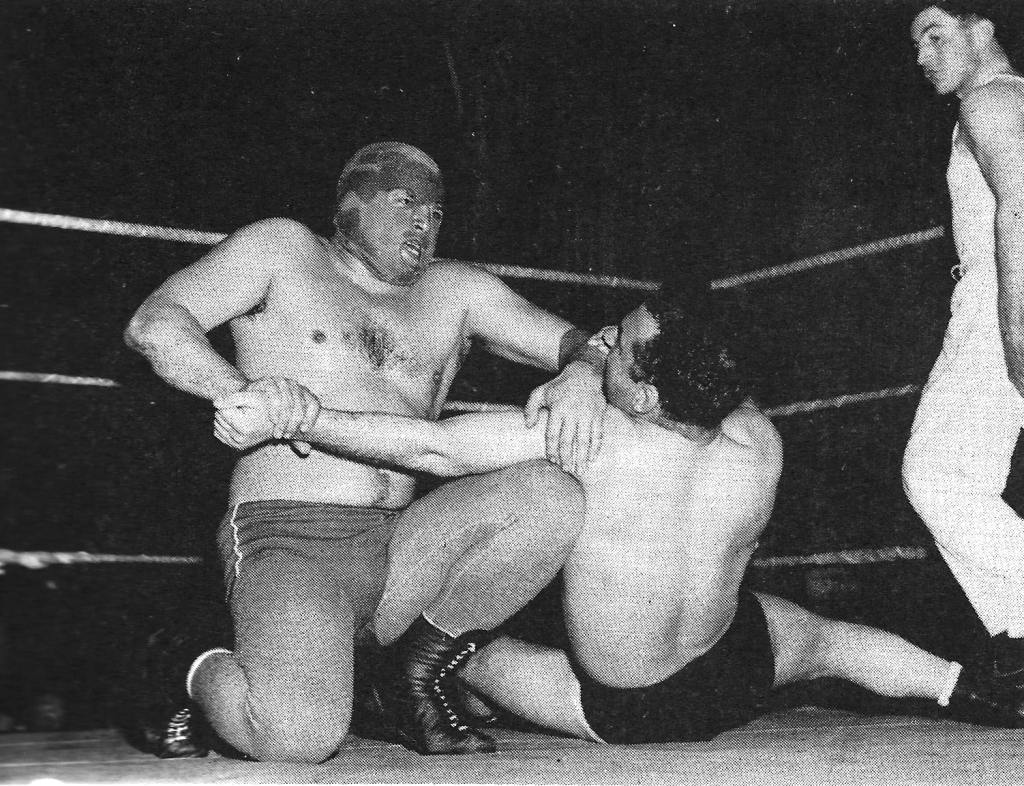 It was all about leverage my boy, leverage. There was no finer exponent of the philosophy than the masked man of many years Count Bartelli. Bartelli, seen here in one of the rare photographs from his twenty year masked career, is seen in action here against Wigan’s Ernie Riley.