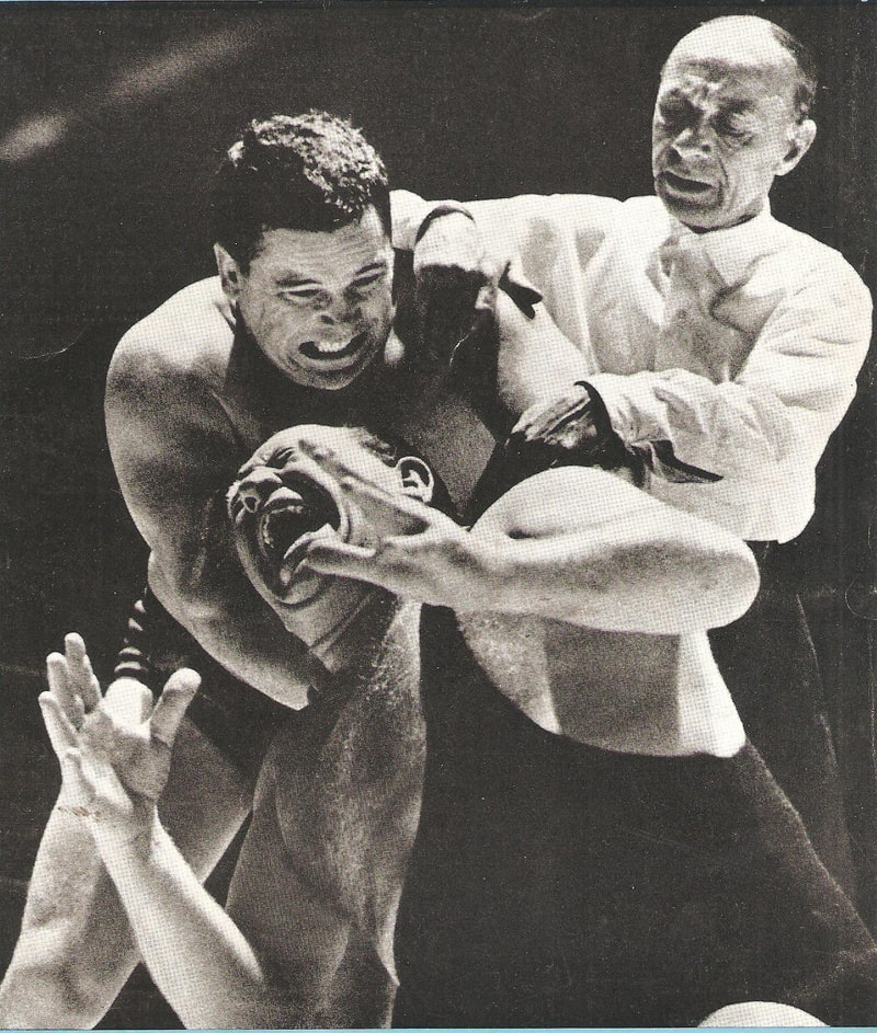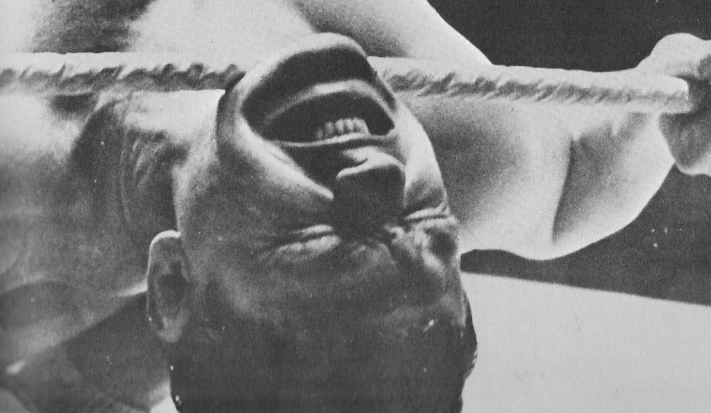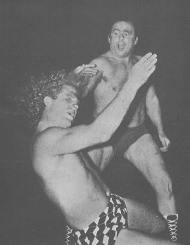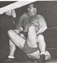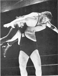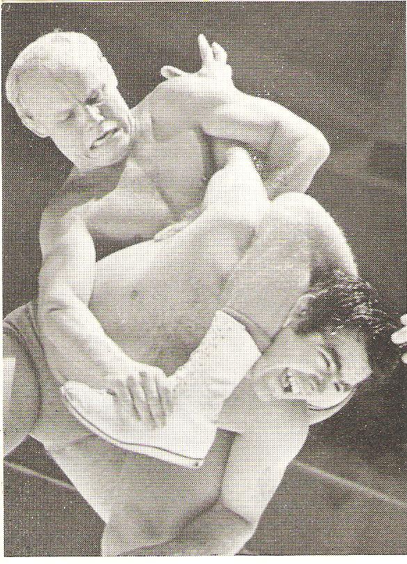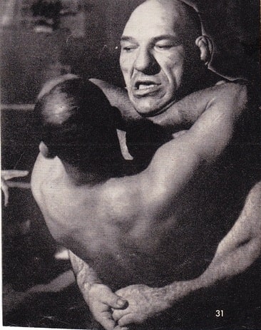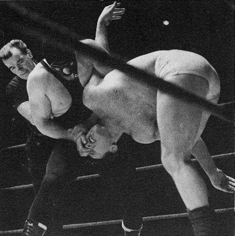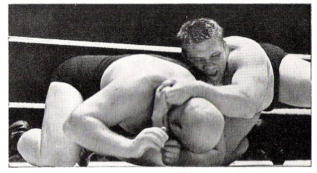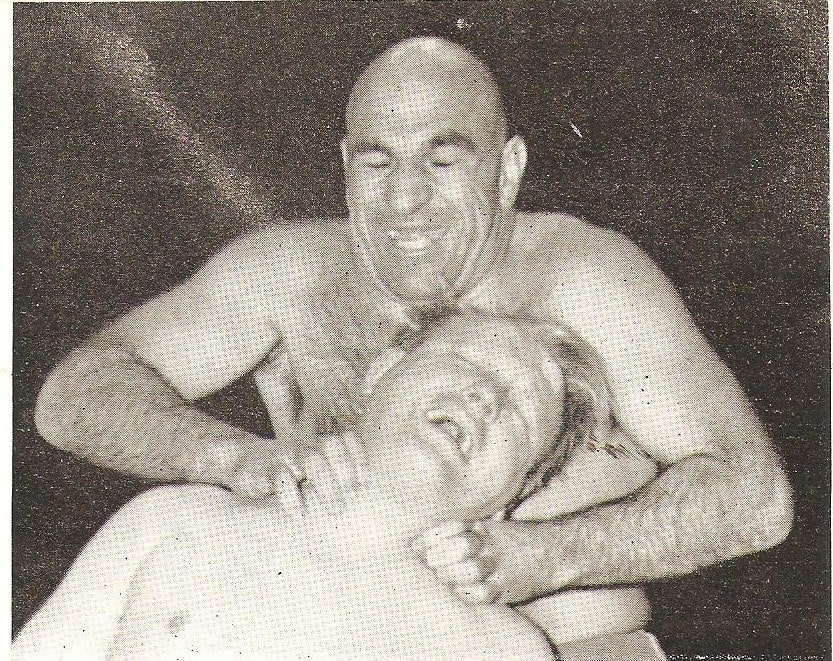French heavyweight Maurice Tillet wrestled as The Angel and packed halls both sides of the English Channel in the immediately post-war years. This most gripping illustration of the bearhug needs no words to describe the terror aroused.