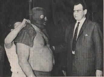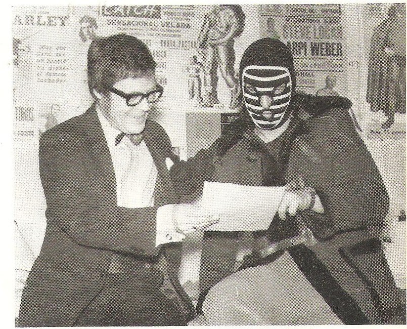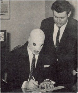 Marketing hype 1962-style. The White Angel signs on the dotted line for his “Loser To Unmask” showdown with Doctor Death. Such scenes whetted the wrestling fan’s appetite for a major match-up, which would be played out in various venues.