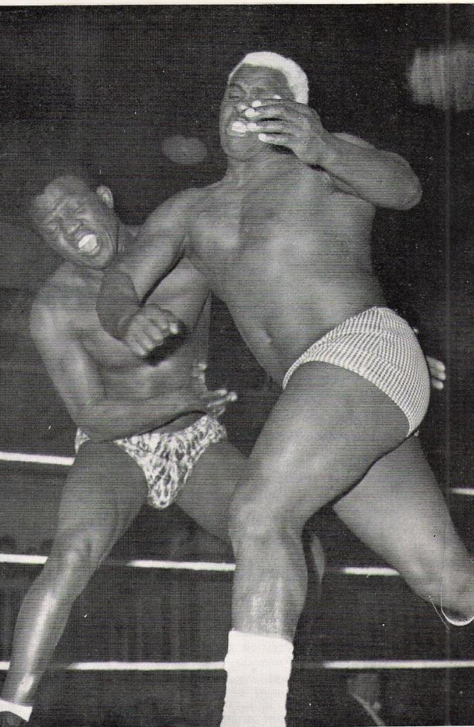 The earliest in-ring photo to hand of Kendo Nagasaki, seen here facing his very frequent 1965 foe, Big John Cox of York. Cox claims the notable first ever recorded defeat of Nagasaki, that same year.