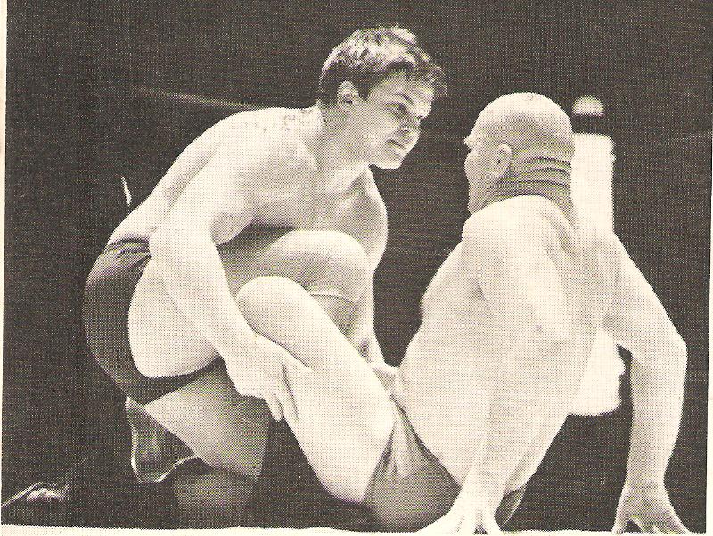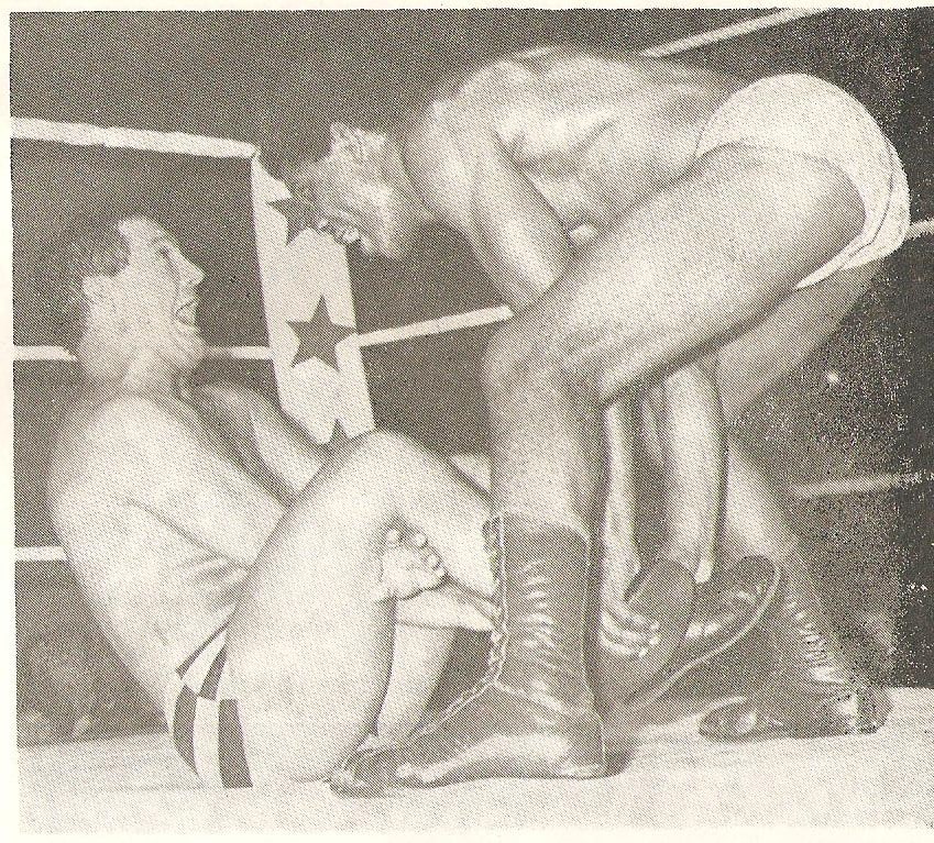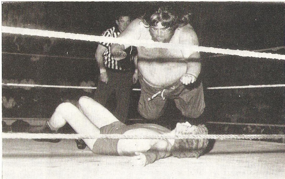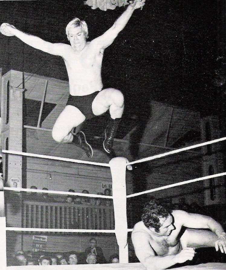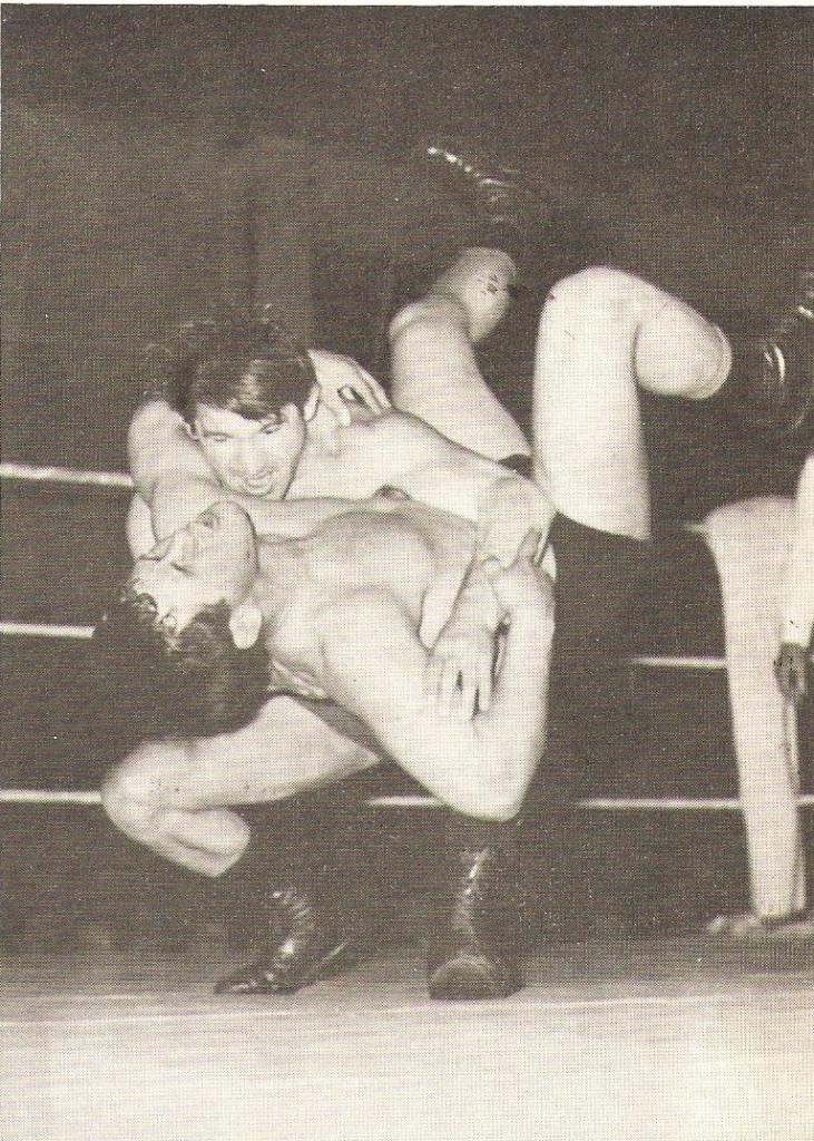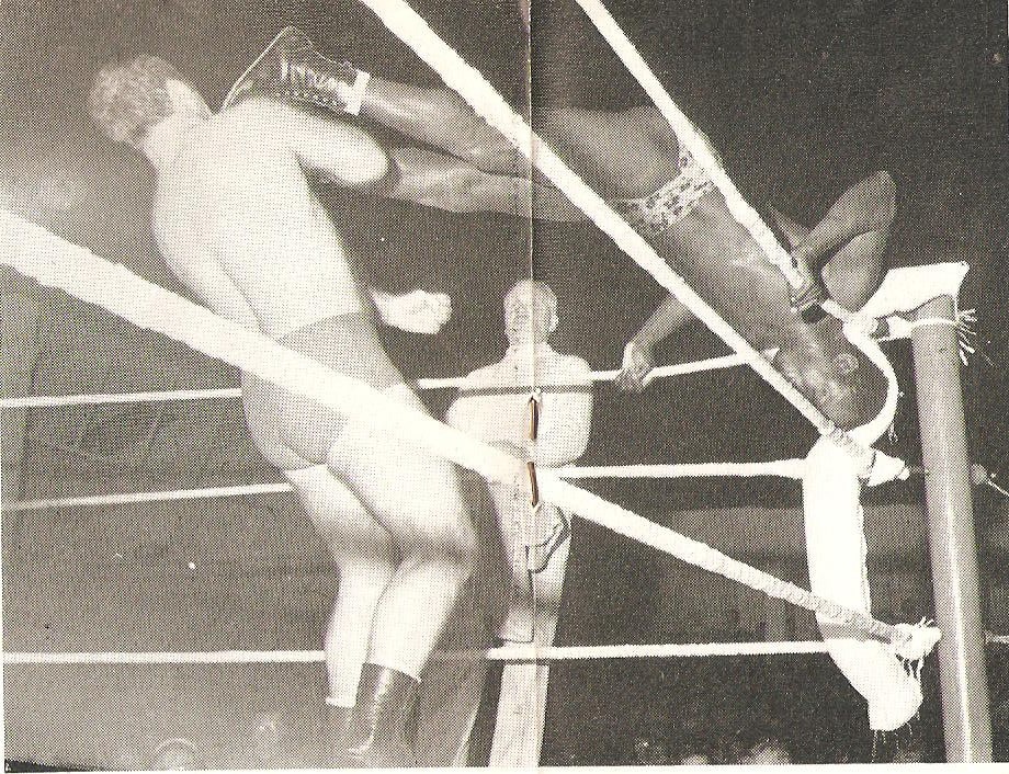 Pat Roach was never in a dull bout and ensured a variety of aerial moves for the spectators’ enjoyment. Mike Marino looks justifiably concerned at what might be coming down to land on him.