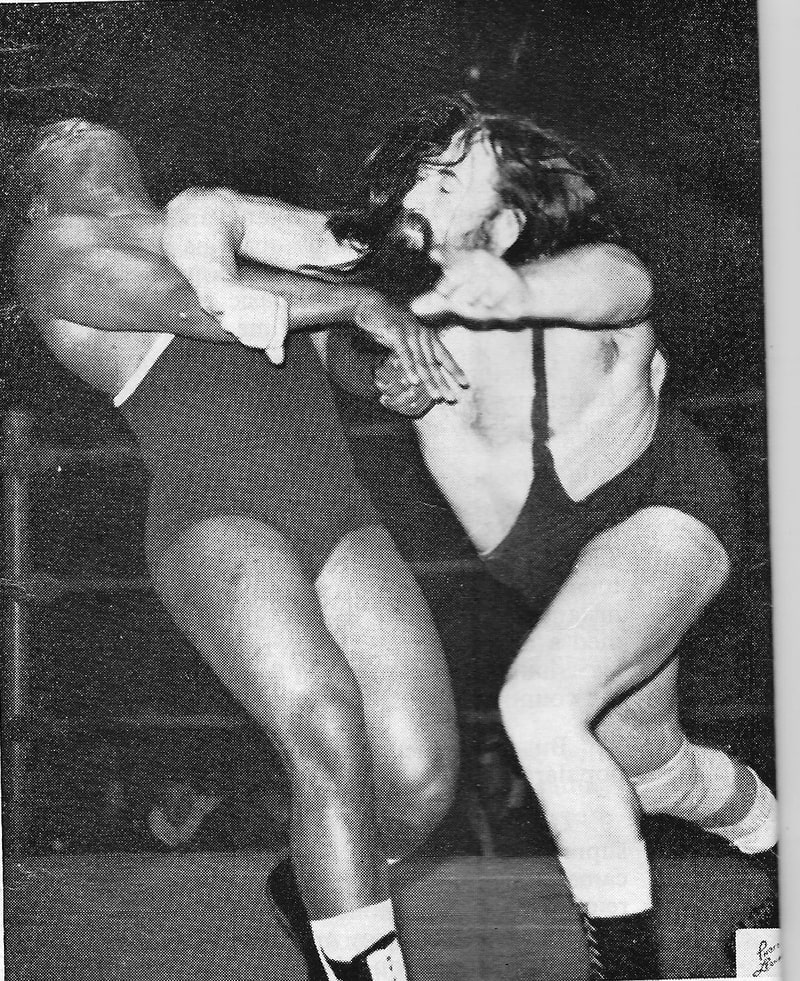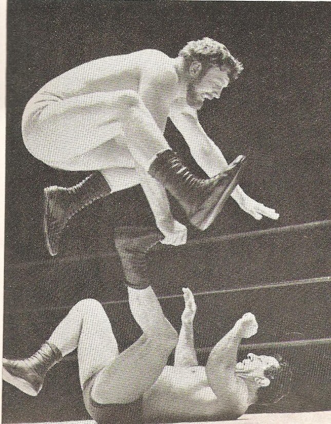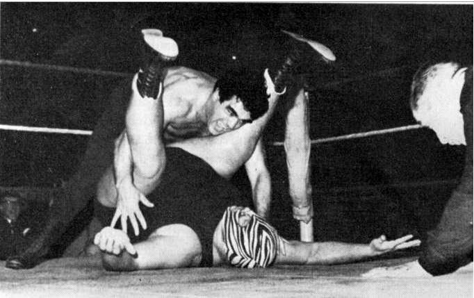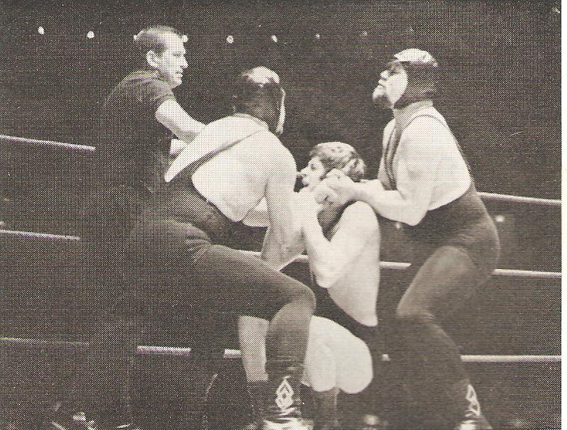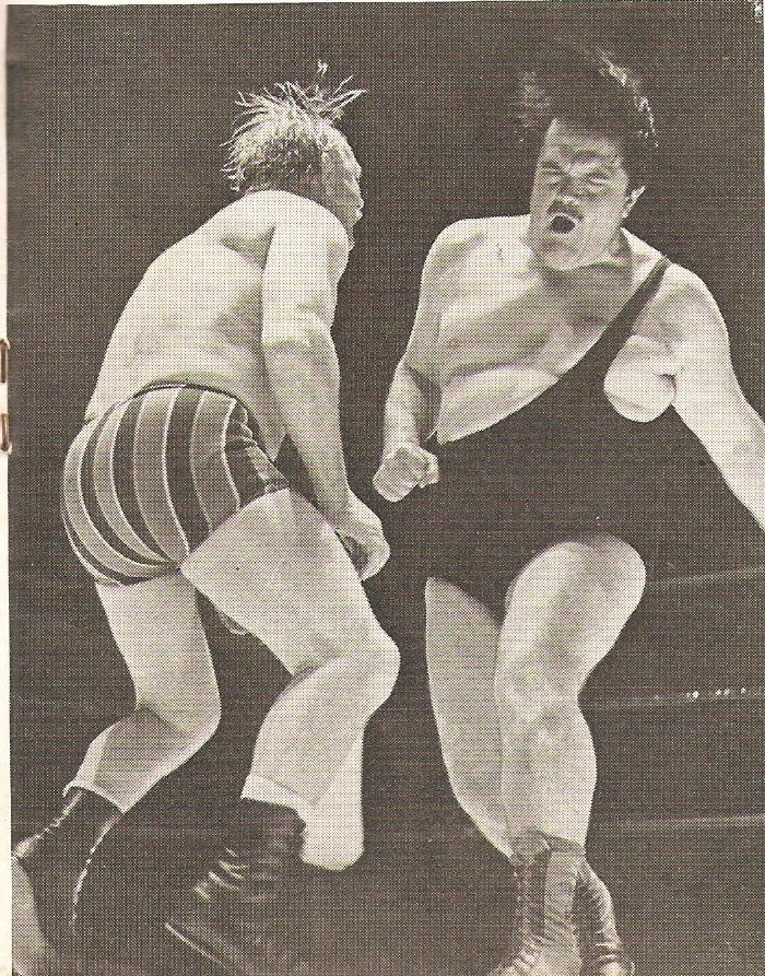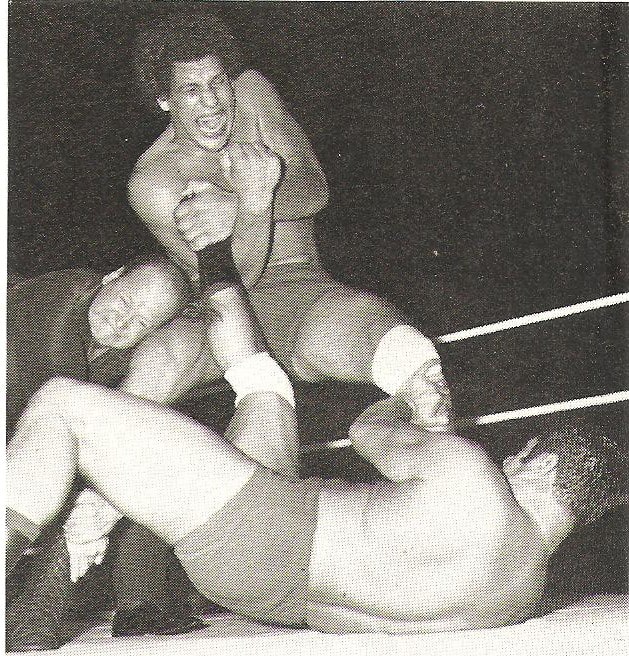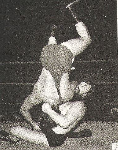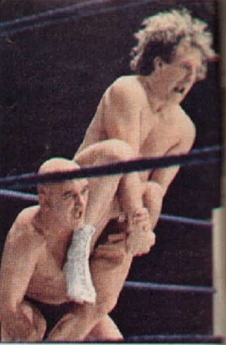 Pat Roach was never in a dull bout and ensured a variety of aerial moves for the spectators’ enjoyment. Mike Marino looks justifiably concerned at what might be coming down to land on him.