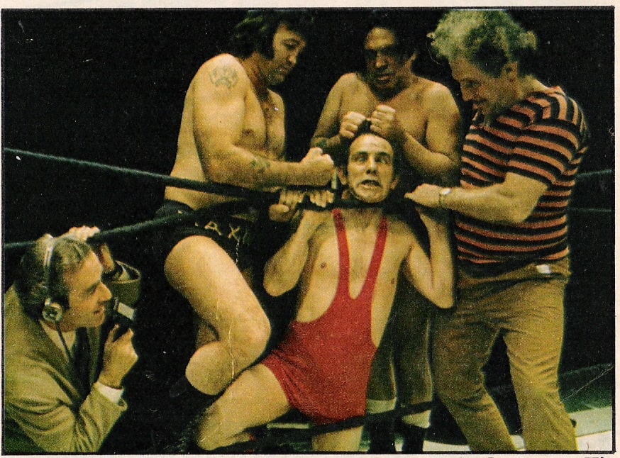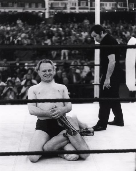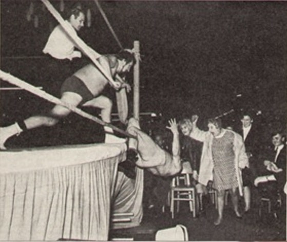 The Royal Brothers sprang to nationwide stardom after 1963’s first televised tag match. The sixties jet set embraced them and their peers enthusiastically. This shot of the boys with pop idol Adam Faith will not be the last time you see V.I.P.s from outside wrestling keen to be seen linked, here literally, with the stars of the squared circle in this Wrestling Heritage countdown.