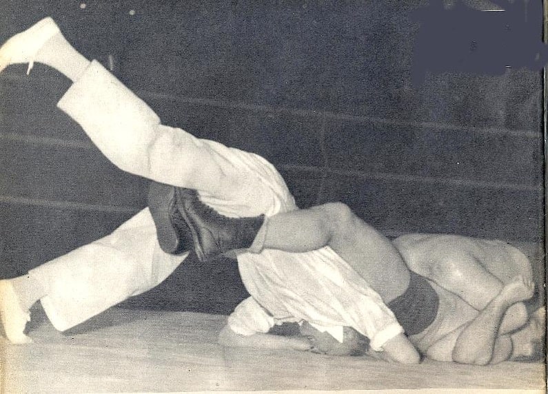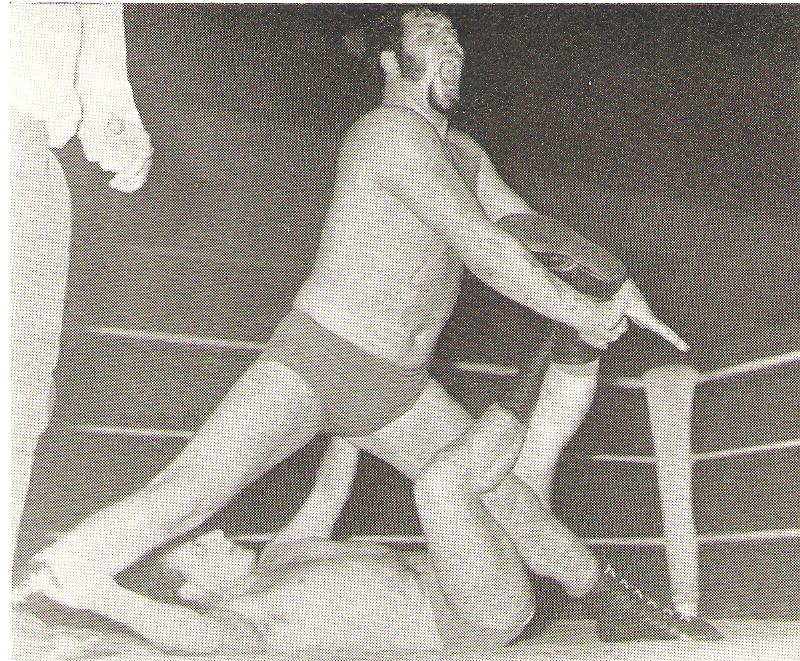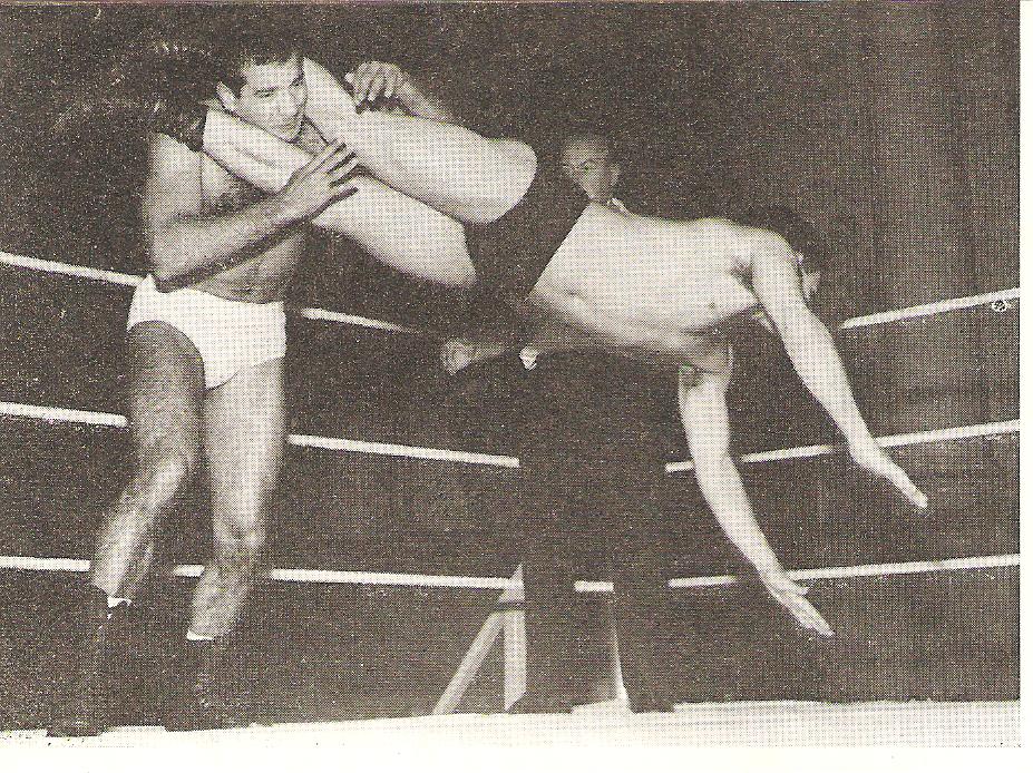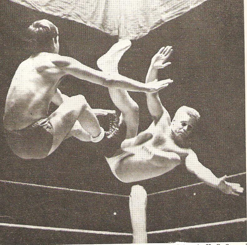 The Flying head Scissors was one of those oft attempted moves but the result was frequently minimal contact leaving the victim with work to do. Al Miquet was the master of this move and leaves little doubt that Rene Ben Chemoul will have to go with the flow in this well-snapped shot.