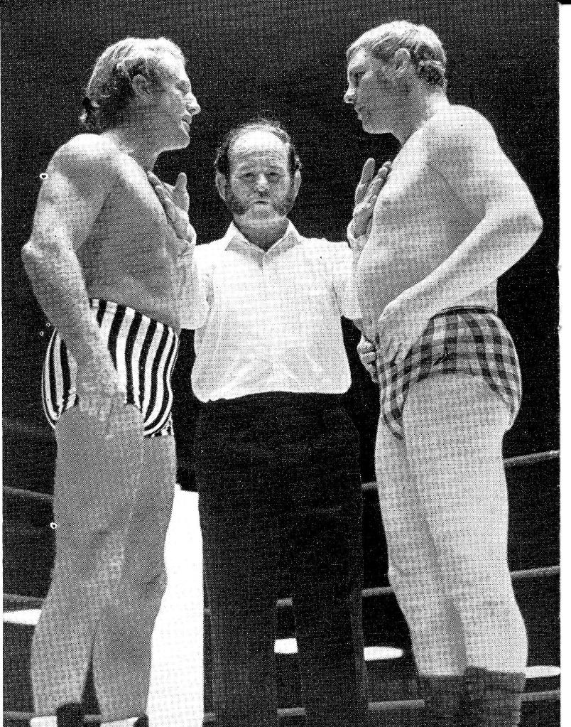 Laydeez and Gennelmeen, this is a four ten minute round staring contest between Jackie Mr TV Pallo and Judo Al Hayes. The pre-contest preliminaries were an essential part of Heritage Years wrestling, with the pep talk from the referee Cunningham reinforcing once again that we were about to witness a genuine sporting contest.