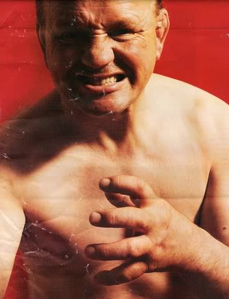 Guess who! A fascinating pose which conveys an aggressive and almost neanderthal character quite at odds with the wrestler’s famed in-ring persona. Stories of the injury he would inflict upon his own hands are legion.