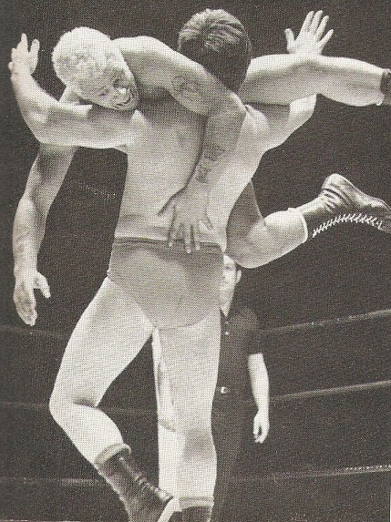 Alan Dennison hoists Jon Cortez. Dennison used his strongman persona meaningfully in the sixties, particularly in numerous tag encounters. Cortez winces in a way that defies anyone to say wrestling was fixed.