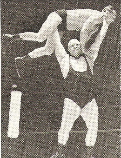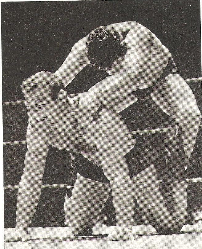 A fine illustration of how weight, and here height differences can be overcome in wrestling. So often the temptation was to compare weights with boxing, and decide a catchweight bout was a mismatch. Here, the shorter wrestler uses his height advantage to masterful effect.