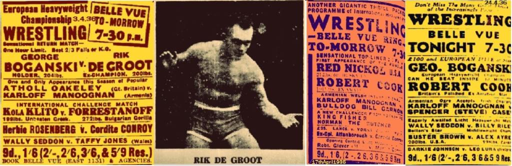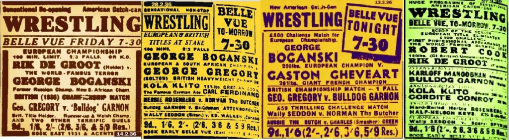 But the bills show the story that Kath Look now wanted George Boganski to be champion of Europe. So it is clear that Boganski takes it and Gregory gives Garnon a chance of the British title. Gregory retains it and gets his shot at Boganski. Would have been a good contest because both men would not have been big heavyweights, their skill was on the top level. Boganski retains.