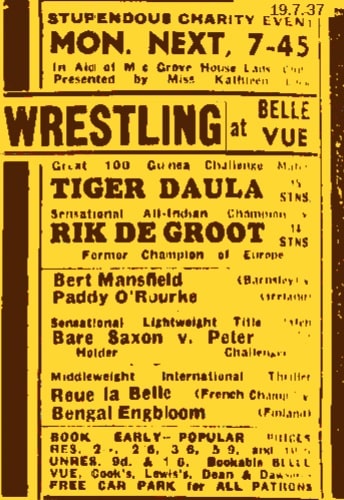Grove Lane Lads Club was in Cheetham Manchester and was a sports club for Jewish Boys. I know the original Belle Vue owners were said to have been of Jewish origins. Must have been great to have had Belle Vue batting for you. Bet that event did well. Tiger Daula, the man who had beaten Pojello in March to be the contender for a shot at Jack Sherry for the World Title, was top of the bill. You could get in for 9d (nine old pence) in those days.