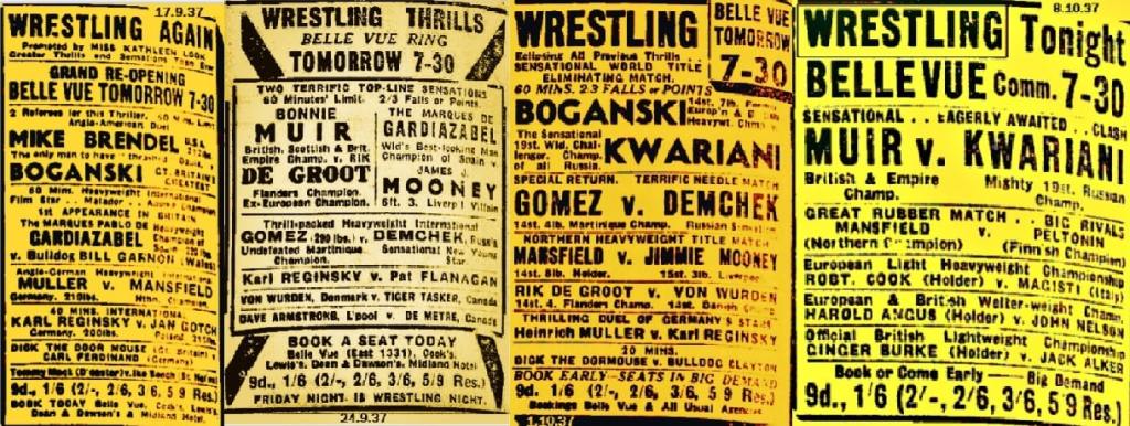 My first observation is six bouts per show and cost implications. Bonnie Muir is there as British Empire Champ. Somehow Fazel the Flower is British Champ, which is another one that can be added to that list of 1930’s champs that have little lineage whatsoever. Tiger Daula, Boganski and Pojello must have cost money. Things must be good to be able to pay these guys.