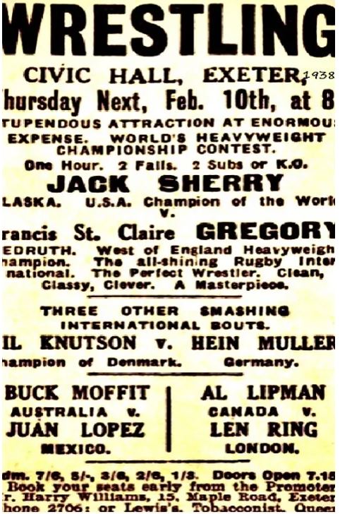 Alaskan Jack Sherry defended his World Heavyweight title in a match with Francis St Clair Gregory at Exeter on February 10th. Posters described Gregory as “The Perfect wrestler. Clean, classy, clever. A masterpiece” In March it was the turn of Russian George Boganski at Plymouth. Dave Armstrong was another that tried in vain to take the American’s title at Blackburn in October, Bonnie Alan Muir tried his best in November, with Douglas Clark facing the champion at Belle Vue in November and December. The November meeting was a genuine clash of the giants, one final cash grab following a decade of intense rivalry, with Clark losing with a badly cut eye ending the contest.