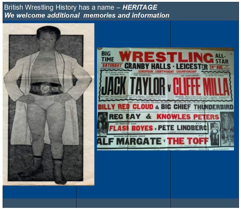 We first come across Cliffe Milla in April 1960, some time after turning professional. He was in his early twenties and challenging Jack Taylor at Spalding for Taylor’s European championship. Cliffe lost that one but it was the first of numerous championship challenges. Jack Taylor always enjoyed wrestling his young protege. For many years fans talked about Cliffe’s three attempts to take Taylor’s European lightweight title at the huge Granby Hall in Leicester, finally grabbing the title in their third contest.