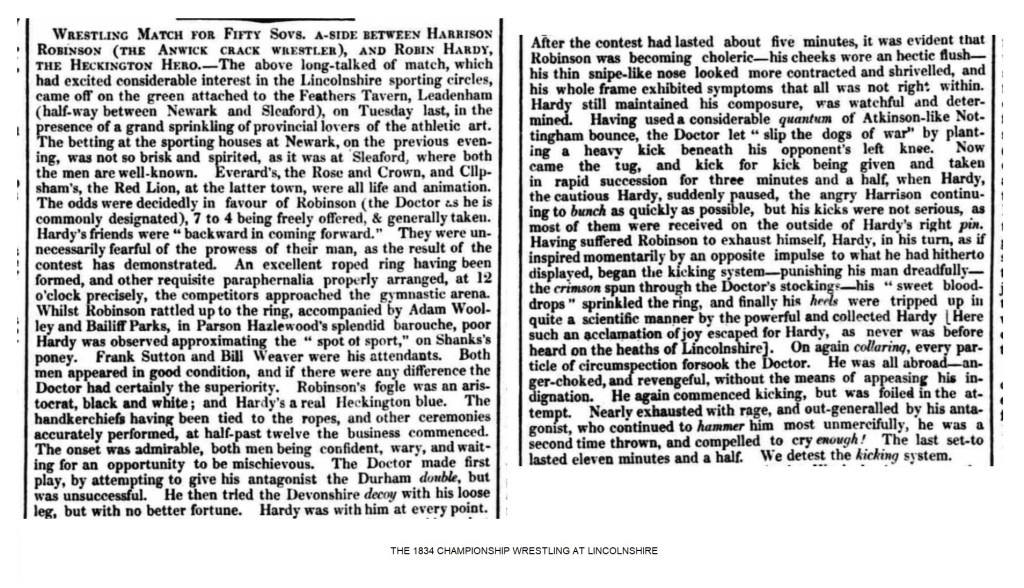 This “rounds” system had a very strong resemblance with the collar and elbow wrestling matches after the Lincolnshire fashion (the deadliest “kicking form” of traditional English wrestling) in which they only recognized the fair falls on the backs and didn’t count the number of half-falls (read rounds). Thus said the combatants would collar each other and desperately kick shins for many, many “rounds” (go-downs) until finally the fair back was given, after one of the two was no longer able to stand and simply was pushed backwards, tripped or back-heeled. Interestingly, in 1834, the Lincolnshire championship wrestling match ended differently, one of the two simply quit the bout. Yes, Lincolnshire wrestling was in fact very similar to the old Lancashire clog fighting. And this fact makes me think that originally the clog fight was a form of Lincolnshire wrestling which over the time degraded and transformed into “something else”. And not only that, their wrestling or better say kicking fashion has evolved far and beyond, the Lankishir wrosler developed a certain habit that of finishing his felled opponent kicking him into senselessness thus ending the match.