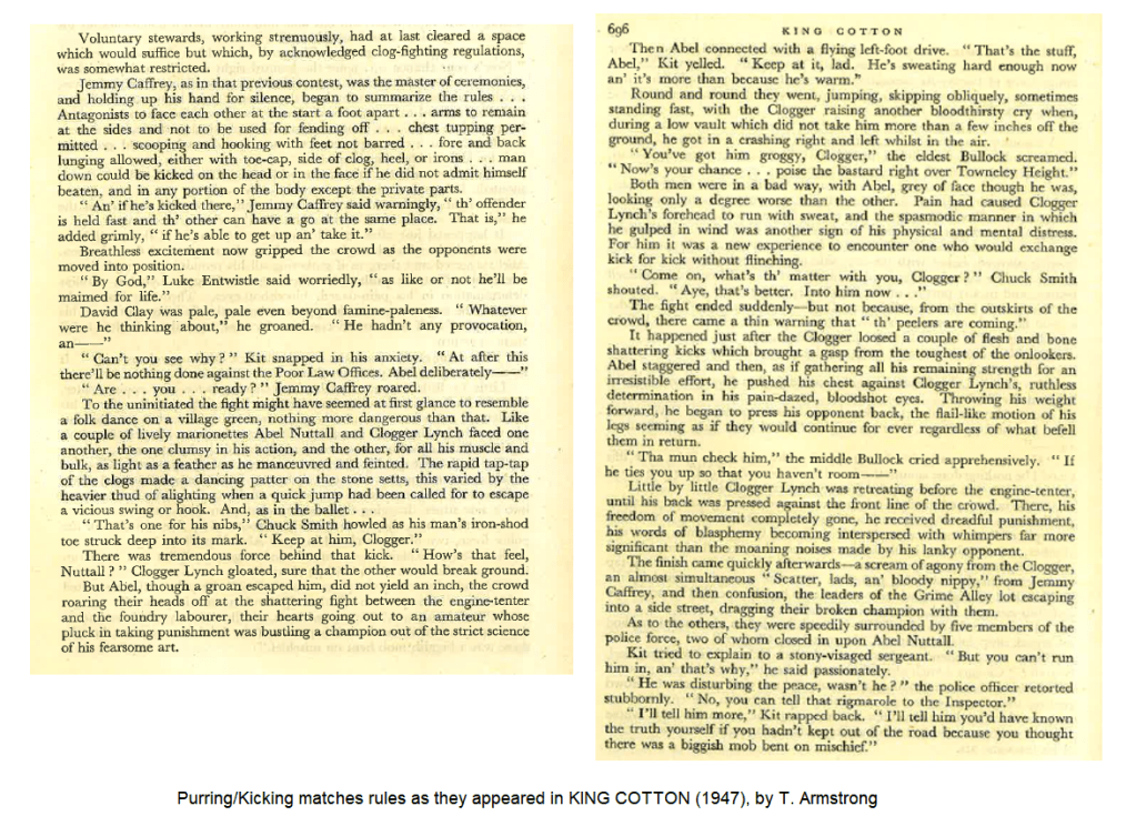 “We transfer to our column from a Liverpool contemporary a graphic description of “scientific” brutality as practiced in Lancashire. The degrading pastime of “purring,” it appears, is peculiar to that county, and the writer, who has evidently been an eye-witness of what he describes, gives a fearful picture of human ferocity among the South Lancashire colliers and ironworkers in the pursuit of this brutal and barbarous indulgence. For the benefit of the uninitiated, it may be useful to mention the leading features of what is termed “the style “down i’ Lancashire,” in which her stalwart “lads” are so fond of showing their prowess, with more than the courage and all the savagery of the wild beasts of the jungle. “Purring is the local synonym for kicking, and a fellow who can “purr” in “style” is hailed by his contemporaries as a wonderfully clever lad dexterous in the use of the foot, armed either with hob-nailed shoes or iron-plated clogs. “Scientific purring” we are told, is only a playful term for something very dreadful, it means neither more nor less than deliberately kicking a man’s eyes out, or causing his brains to protrude through the skull, or the breaking of his ribs, and, may be, the breaking of his neck. The “play” is managed in this way: The players strip naked to the waist, then face each other, try to get a grip of each other, as if in the act of wrestling, and twist their legs together so that one may fall; and should the uppermost man be at liberty, and have the under man at his mercy, the partisans of the former excitedly shout, “Na, tha hes him; go into “him; purr his yed; good lad; tha’s warming…”