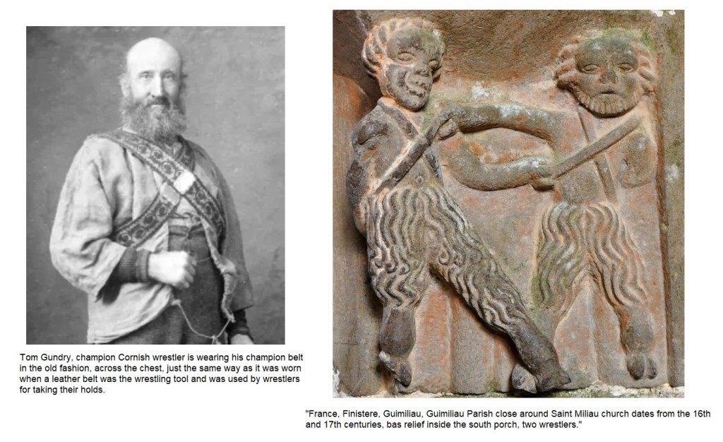 A very similar to the “Hobbinol or Rural Games” collar-belt wrestling style is depicted on the image which I found online in ALAMY collection. It shows two prize-wrestlers wearing “collar-belts” harness. The carving originates from Brittany, France, the land of Breton wrestling. The item description by ALAMY is as follows. “France, Finistere, Guimiliau, Guimiliau Parish close around Saint Miliau church dates from the 16th and 17th centuries, bas relief inside the south porch, two wrestlers.” The historical Breton wrestling and traditional English collar-style wrestling definitely share history and are close relatives.