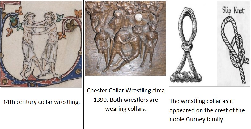 This extract from John Lane’s 1621 Pastoral Poem, “Tritons Trumpet” talks about wrestling tools called collers which were worn by contestants and by which the wrestlers took holds.