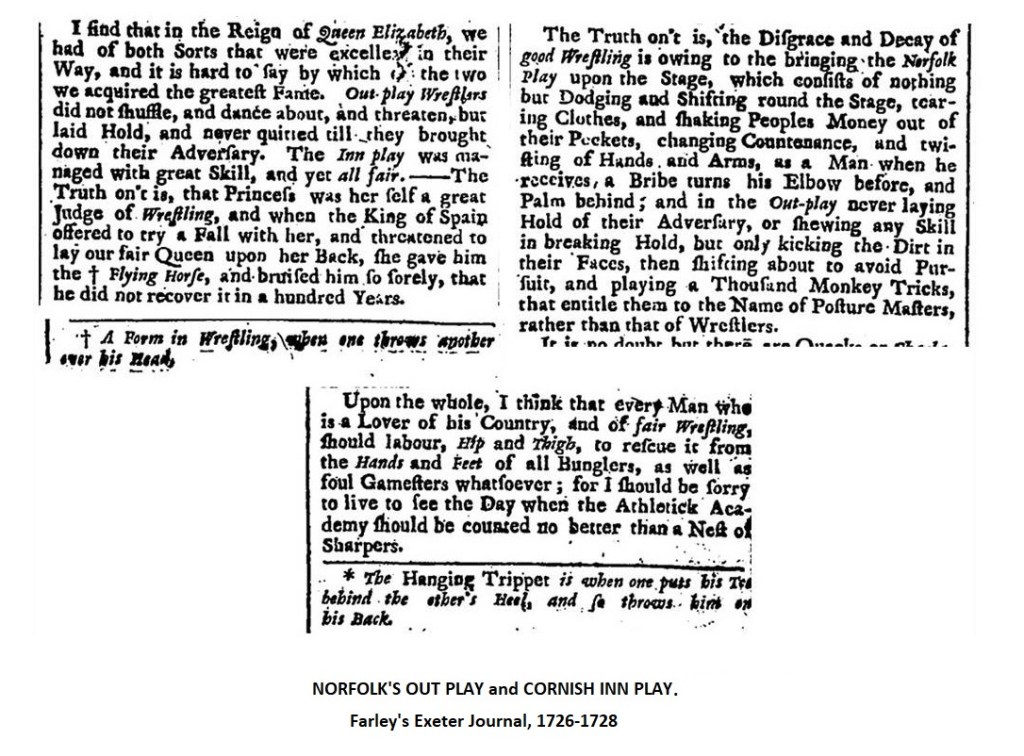 According to the Nottinghamshire’s second baronet of Bunny Park, Sir Thomas Parkyns (1664-1741), the author of “Inn Play or Cornish Hugg Wrestler” and of the “General Rules of English Wrestling,” (1727), the two most popular styles of wrestling in England were Norfolk’s “Out-Play” and Bedfordshire’s “Inn-Play” of which the Cornishmen were the best exponents. The core skill of traditional English wrestling styles was in using the legs and feet for throwing opponents to the ground; these wrestling techniques were known as “hooking” and “tripping” respectively. Hence, likely the names of these two folk styles were also based on that particular wrestling strategy, namely: