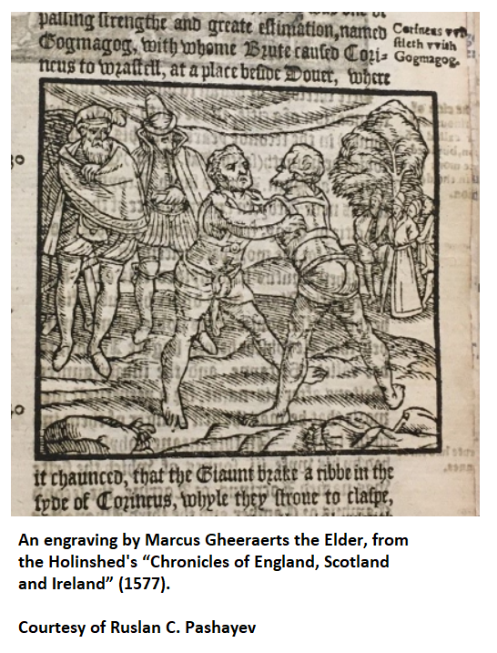 The 1577 book by Raphael Holinshed (c. 1525 – before 1582) called “Chronicles of England, Scotland and Ireland” on Page 15 of Vol.1, Part 1 features an engraving by the famous Flemish artist Marcus Gheeraerts the Elder (c. 1520- c. 1590) which depicts a wrestling match between Corineus and Gogmagog. The antagonists are shown wearing an elaborate harness around their shoulders and the upper torso. It is very possible that this is exactly how the 16 c traditional English wrestling collers looked like. On that woodcut the wrestlers are shown leaning towards each other, thus I assume protecting their legs from the reach of the vicious kicks of their opponent, their feet are wide apart and knees are slightly bent which suggests the push, pull, sway and lift being among the most common applied techniques.