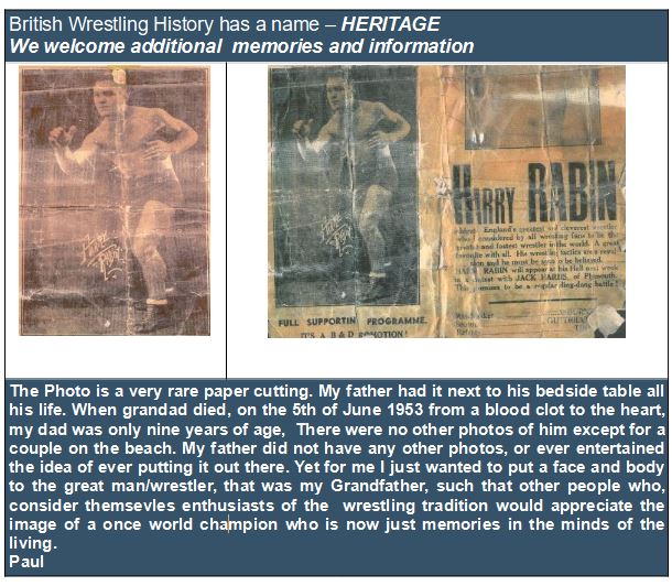 Born in 1914 Harry Rabin was the working class hero, complete with two cauliflower ears. An accomplished amateur wrestler who made a successful and colourful transition to the professional ranks.
