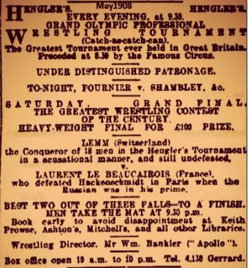 I have a slight problem with all this. It does sound a bit like the match that Riley and Pye had in 1933. Could it be that these Lancashire wrestlers, who had worked in the London Music Halls had realised that there was money to be made in the way that wrestling entertainment was portrayed to the public? I leave it to the reader to form his own opinion.