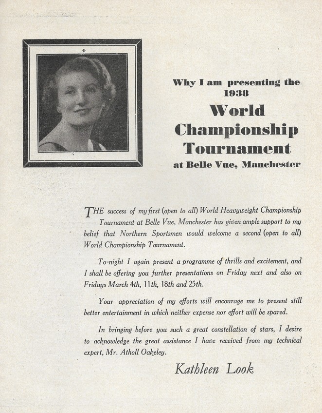 Her Belle Vue Promotions featured international stars and regular championship contests, with the biggest names of them all, including world champion Jack Sherry, The Angel Maurice Tillett, Douglas Clark and Karl Pojello. .In 1934 Kathleen Look promoted a titanic struggle at Belle Vue, a British heavyweight championship match between two claimants, Douglas Clark and Bulldog Bill Garnon. Billed as challenger by Kathleen Look it was Clark that emerged victor by two falls to nil.