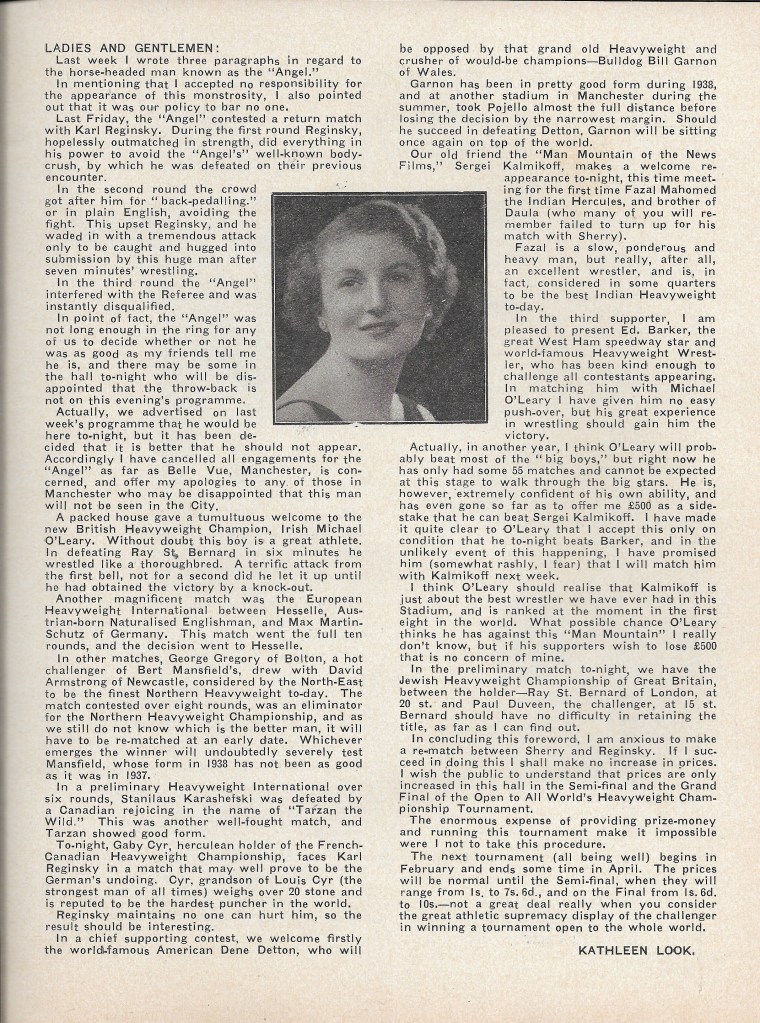 The most glamorous of wrestling promoters and probably the only one with qualifications in shorthand and typing. In the case of Kathleen Look it was a case of beauty, brains and power. Her name was often associated with that of Atholl Oakeley, who she described as her Technical Adviser. Oakeley initially employed her and brought her into the wrestling business to become promoter at Manchester’s Belle Vue in 1934. Whatever the long term business relationship between the two Kathleen seemed to come into her own and work more independently from Oakeley. Ron Historyo: “It may well be accurate to call her a breath of fresh air. More creativity, panache and strategic planning were evident. As far as matchmaking at Belle Vue goes Doug Clark was matched four times with Jack Sherry. I don’t think Clark would have accepted Oakeley organising this. Miss Look after gaining some experience would have been capable of bringing over international stars on contracts.“