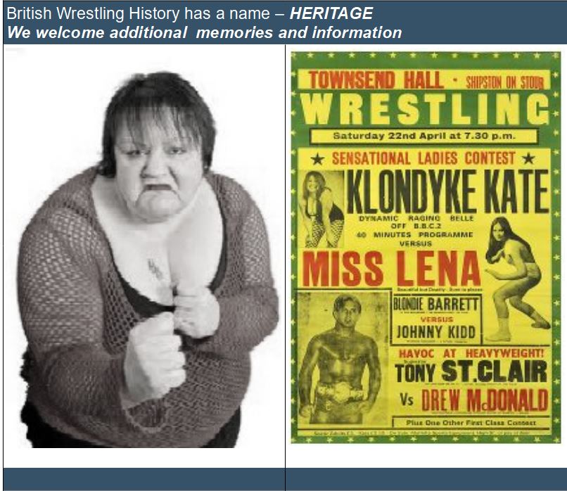 Those old enough, with the longest of memories will remember the original Klondyke Kate of the 1960s, otherwise known as Chris Thompson, one of the wrestling daughters of Jack Cassidy. Chris soon morphed into Hellcat Haggerty, leaving the Klondyke Kate persona to be taken to greater heights by girl from the Potteries, Jayne Porter.