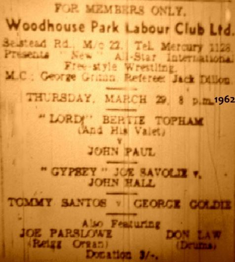 This was very much a Cabaret Club. Allegedly owned by a Ginger Chilton, at this time it brought in stars like Chubby Checker and Gene Vincent. One thing was for sure, this was Independent and the promoters were local lads. Which ones I am not quite sure. Grant Foderingham, the Black Panther was a promoter in his own right with his own gym, but it was about this time that Danny Flynn and Fred Woolley defected from Joint Promotions to run their own business. The wrestling often clashed on Thursday nights.