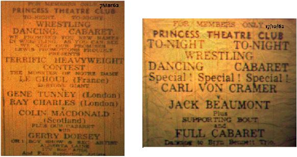 In 1963 Jack Beaumont (Belshaw) died after a bout in Chorlton at just age 45. I don’t know but I suspect that this was the venue. And a teaser here, Gerry Dorsey in the Cabaret above. I think older members will know the answer, but a few years later, for a while he was almost as big as Tom Jones, but his alias was far more complicated. The capture of the Princess Theatre Club bills is so nostalgic that I present Chorlton in it’s own gallery.