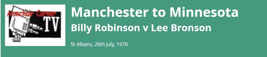 Kent Walton was present in all his glory throughout the bout, positively adulating Robinson in glowing terms hitherto reserved for Mike Marino and Ken Joyce. He outshone the caption that billed Bill from Lancashire, pinpointing Manchester as home, and displayed his habitual loose grip on time by assuring us that fans would remember Bronson’s father, Norman the Butcher (Ansell, final bout 1948, eight years before the advent of regular ITV wrestling), whilst bemoaning the fact that many fans were too young to recall Robinson’s sixties heyday. This fleeting glimpse of the reigning Empire champion, no less, was most enjoyable and served to supply just about as many answers to our questions as it did to throw up completely new imponderables that disappeared back on the plane to Minnesota