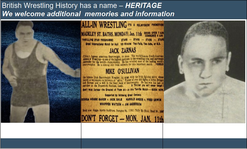 Our earliest documented sighting of Mike O’Sullivan was in January, 1934, when he substituted for Vic Coleman at the Brunswick Stadium in Huddersfield when he was outclassed by Douglas Clark, losing by two falls to nil. We did, though, find two unverified matches in 1933, both in London, which might be significant as an unconfirmed newspaper report said that he was born in the capital. A later unconfirmed report gives Manchester as his place of residence. At some point he married a girl from Sunderland and was stationed in the North East after being called up to the Army during World War Two and billed as a Sergeant in 1941.