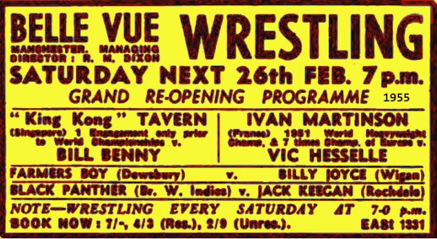 Manchester fans will be aware that every year Kings Hall wrestling stopped for the circus and it was quite late starting up again. Picking up on opening night in 1955 I have the bill, and the promoter as always since wartime was Dick and Jessie Rogers. I don’t think Bartelli ever worked for Rogers, maybe just too busy with Wryton, or was it rivalry?