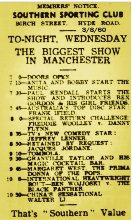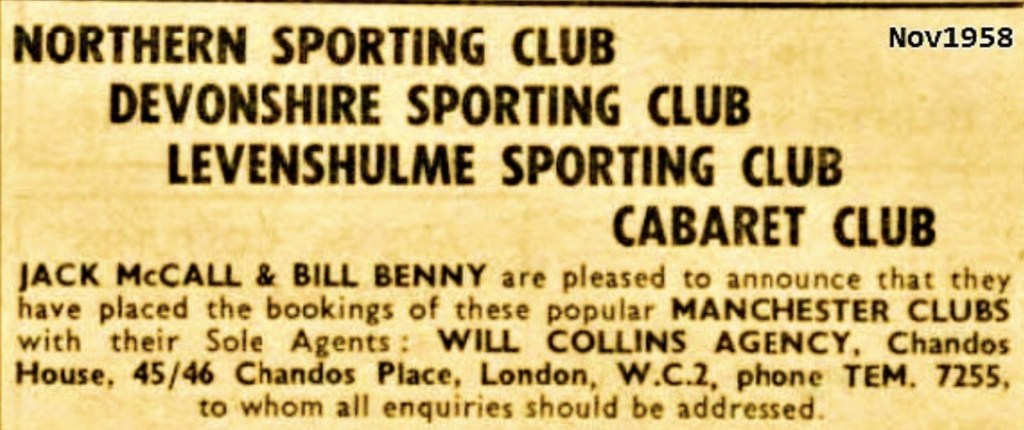 You can see examples of two of the other clubs trying wrestling out earlier in the summer of 1958. One assumes it worked and Bill Benny committed to it. Somewhere people with money were backing these clubs. The Moss family were involved with others like the Domino club and the College Theatre. It’s a tangled web. I know Jim Lewis was connected to The Devonshire and I have my suspicions that Bernard Manning may have been tied up with the Northern in Harpurhey.