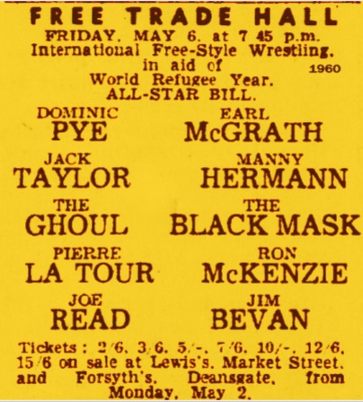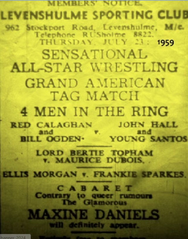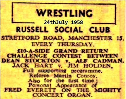 1958 was pretty much the first year any wrestling went into the Manchester Night Clubs. The Russell Club in Hulme was a bit earlier, but that was more of a social club than a full blown Cabaret set up.1958 only had a few shows compared to the blitz that was to come that lasted until about 1963.