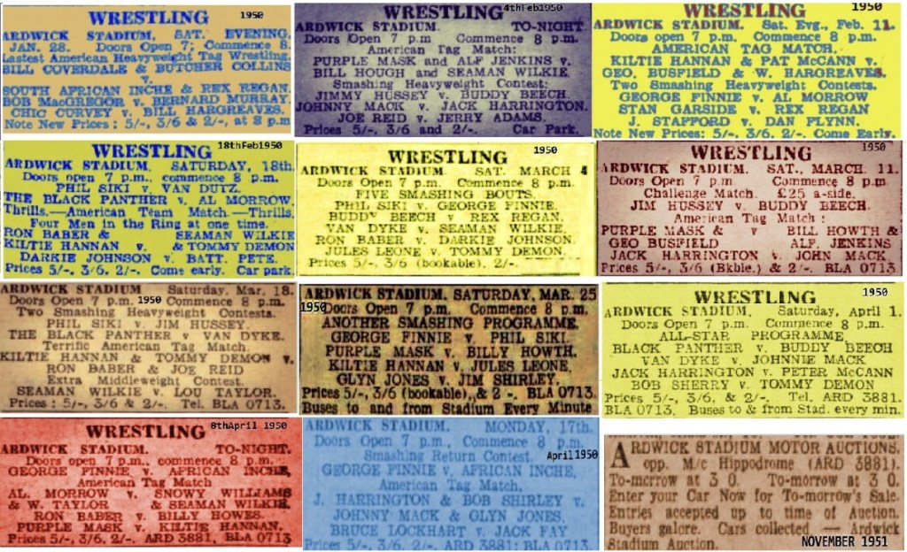 It was such an escape from often a dour life in the factory all week. Wednesday and Saturday Wrestling was sacrosanct, but so too was Bank Holiday Wrestling. 1951 Easter was an example of what happened every bank Holiday. Five shows in eight days. Jack Pye did three shows.