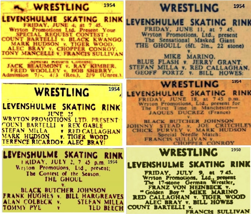 Onto Wryton now on Friday nights. Levenshulme Skating Rink was probably a mile form Belle Vue in Gorton. The sensible thing was to do Friday nights and that they did for at least 1948-1954 where Bartelli was a big star. Covered in my Manchester series but I can now reveal that it came to an end in 1954. Some of the structure was left up to make a sports club, the Levenshulme Sporting Club, that also doubled as a members night club. More about that club and club wrestling later. The final bills that went in the paper were these.