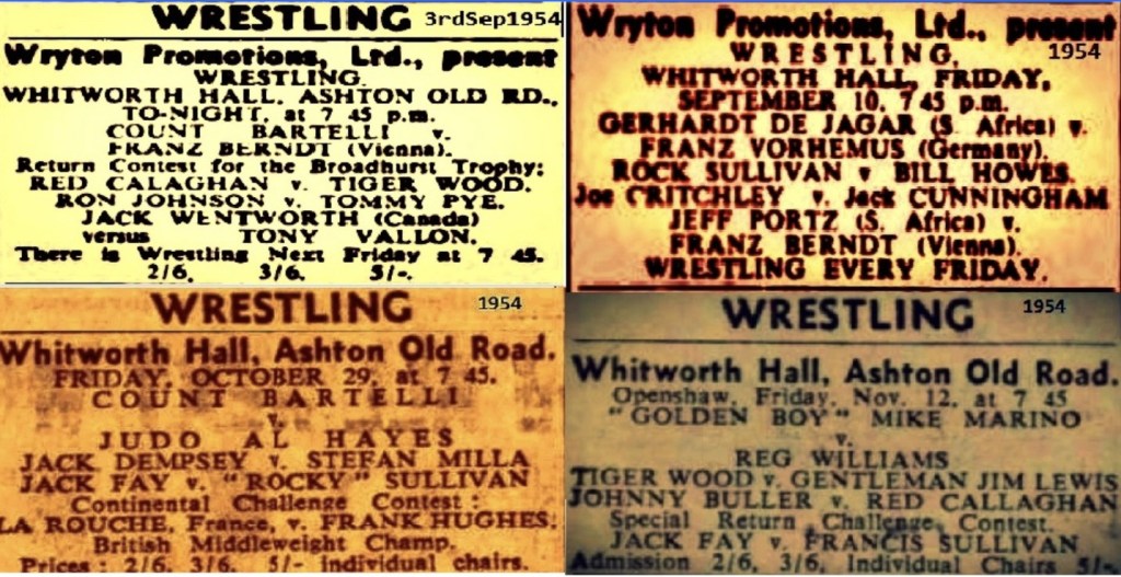 Wryton were not giving up although they were a bit nomadic with Manchester venues. No doubt their own Stadium in Bolton in 1958 was the eventual answer for Fridays. But the new home was the Whitworth Hall in Openshaw on the Old Ashton Road. Bartelli in his pomp, Jack Fay (Ernie Riley) and Billy Howes evident. Here are some of the early bills after the switch. So the end of the Skating Rink caused the end of the Wrestling.