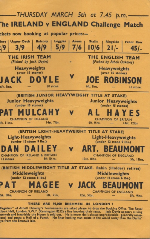 It was Ireland versus England. The Irish team, we were led to believe, was selected by Jack Doyle against an English team, selected by Oakeley himself. Supporting the heavyweights were three Ireland v England championship matches, those being his own British Wrestling Association champions of course, and not the recently formed Joint Promotion Lord Mountevans champions.