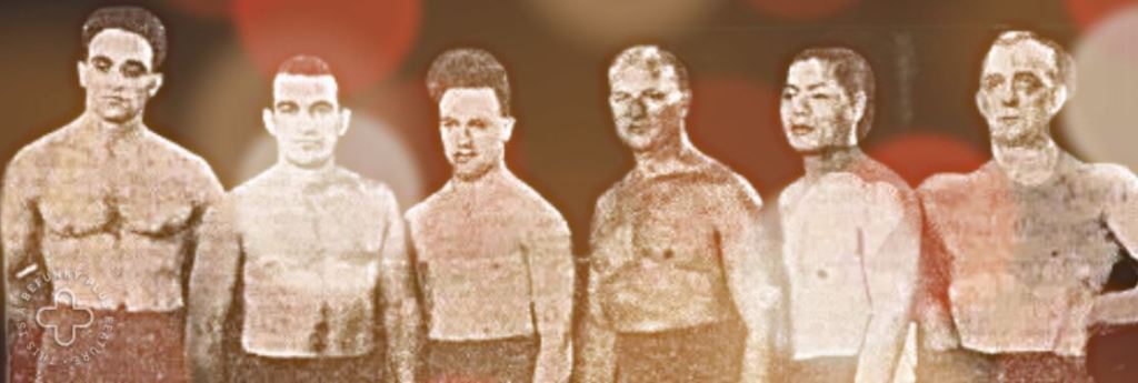 Typical of wrestling though, The Golden Hawk on the bill had to be replaced by Harry Brooks. Six of the wrestlers on the bill are on the picture below. Benny Sherman is second from the left. As can be seen from the picture he is a fair bit smaller than Sam Rabin “TheCat” on the far left.