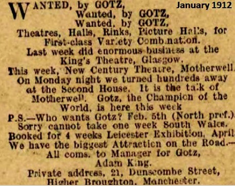 The popularity of wrestling in comparison with the Hackenschmidt era was diminishing, but Peter Gotz continued to have a love of the Music Halls.If you can believe the advertisement (January, 1912 above) Peter Gotz was in great demand.