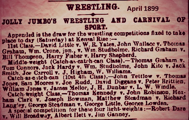 When I wrote about the Hindley wrestler Joe Carroll I explained that the man who changed all this was known as Jolly Jumbo when in 1899 he put on a festival of sports at Easter at Kensal Rise in London.