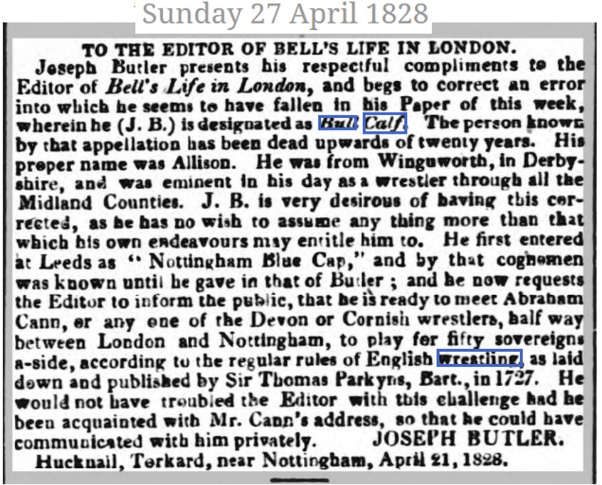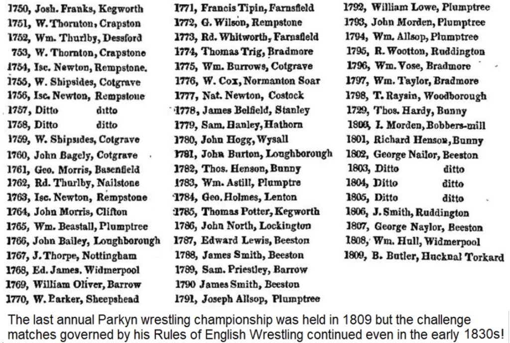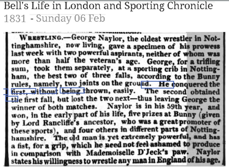 The full list of the Bunny Ring pro wrestling champions appears on Pages 205-206 of the book called “Walks Round Nottingham” (published in 1835) by a sailor and journalist by trade named “Captain” Matthew Henry Barker (1790-1846) who wrote it under an assumed name of “A Wanderer.” The mentioned above list of champions as well as some 1700s-1800s newspaper references to the Bunny Pro Wrestling Ring will follow this article. Notably, neither Cornish nor Devon sportsmen ever competed in Parkyns’ Catch-hold championships. And this makes perfect sense too. In both of the above styles athletes were trained to take holds of jackets only and hence they wouldn’t want to compete on some other unfamiliar to them conditions. In Parkyn’s times the Cumberland/Westmorland variation of an old English Back Hold (or the Hugg) wrestle wasn’t heard of outside of its native area.