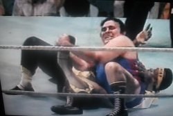 Kent Walton told us it would be disallowed and then found himself selflessly saying he had been mistaken and the fall was fair and square “by inches”. At any rate, Myers was on his way to the predicted victory.