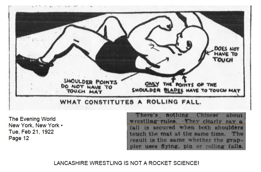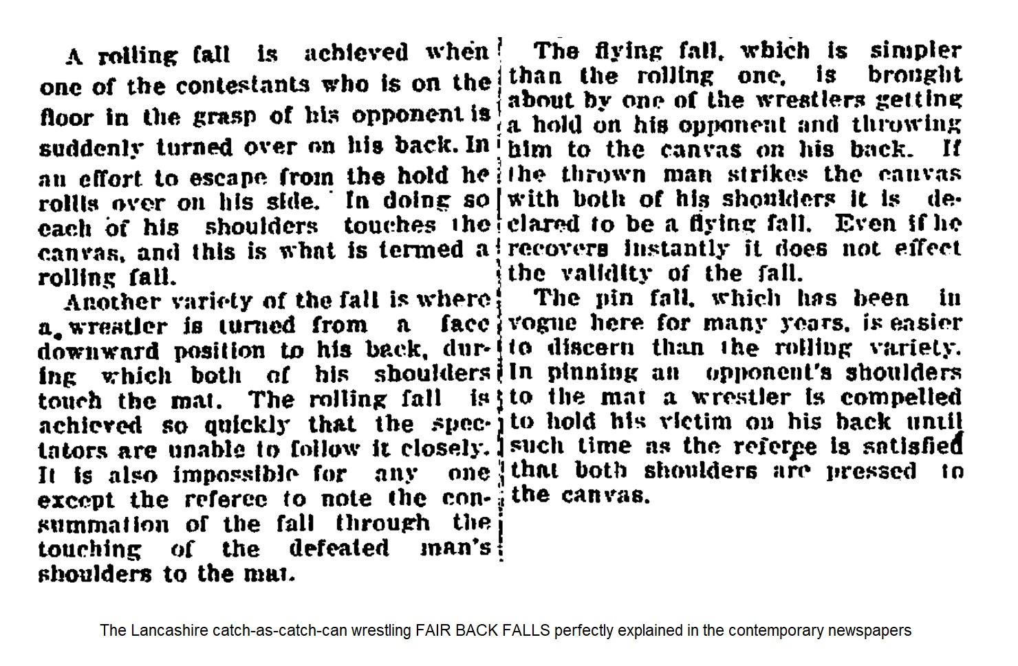 The adopted in Lancashire definition of fair back fall meant an instant touching or striking of two shoulders together, a touch-fall speaking the modern wrestling terminology, and that of course also included the so called rolling falls, when wrestler rolled from one shoulder to the other.