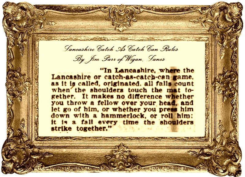 Jim Parr of Wigan, Lancs a popular champion wrestler from the early 1900s thus explained the basics of catch wrestling: “In Lancashire, where the Lancashire or catch-as-catch-can-game, as it is called, originated, all falls count when the shoulders touch the mat together. It makes no difference whether you throw a fellow over your head, and let go of him, or whether you press him down with a hammerlock, or roll him: It is a fall every time the shoulders strike together.”