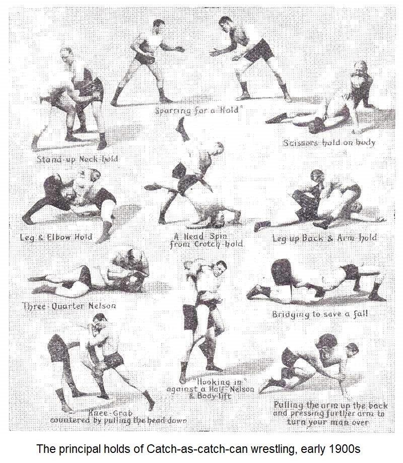 “Among the other wrestling fashions which prevail in our own land, there is that of Lancashire, the most brutal and repulsive of them all. Under its rules almost unlimited action is permitted, and in days not far remote, when “purring” was a favorite sport, among the lower order -a “game,” if such it can be called, played by two wearing metal-tipped clogs, with which they kick each other on the shins and legs until pain and exhaustion led one or other to give way-hardly any device was prohibited. Now it is forbidden to scratch, throttle, bite, or deliberately injure an adversary, and the “full-Nelson” is not practiced. This dreadful hold was obtained by thrusting both arms under the arm-pits of the opponent, bringing the hands round in a lock on the back of the neck, whereby such leverage could be exerted that the vertebra might be fractured or dislocated unless the man surrendered. But, in spite of its amendment, the Lancashire style is not pleasant to look upon, though it has thousands of followers, and many exponents who wrestle frequently for large stakes in the presence of excited crowds.”