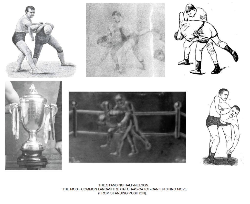 This short paragraph from the 19c press links together the two Lancashire sports, the newborn catch wrestling and the old up and down fighting. Interestingly, the author does mention the full-Nelson hold, a hold which likely was the most common “wrestling” finisher in the fights after the Lanky fashion.