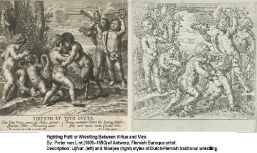 The earliest known immigration of the Flemish textile workers (aka Flemish weavers) to East Lancashire, England goes back to the 1300s. They brought to their new place their traditional rough-and-tumble wrestling style called the Stoeijen which over the time evolved there into the professional Lancashire up and down wrestling/fighting, a combative style which predated Lancashire catchas-catch-can wrestling. In the XVI-XVII centuries French and German “weaving” Protestants who along with the Flemish fled religious persecutions on the Continent brought their old Frankish catch-hold wrestling customs to East Lancashire and West Yorkshire where they merged with the traditional English catch-hold wrestling style and over the course of centuries this combination evolved there into a new culturally unique style of wrestling the Lancashire Catch-as-catch-can. This style went through the various stages of evolution and gave birth to the modern day pro wrestling (catch) as well as it strongly influenced the current international Freestyle wrestling and different grappling styles.